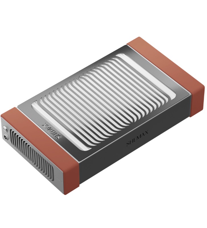 Ο απορροφητήρας της SheMax προσφέρει εξαιρετική απόδοση εξαιτίας των δύο φυγοκεντρικούς κινητήρων του και την ισχύ των 54W. Χάρη στην τεχνολογία «air bowl» (εφέ ανεμοστρόβιλου), η ροή αέρα αιχμαλωτίζει τη σκόνη σε όλη την περίμετρο του μοντέλου και την κατευθύνει στο κέντρο με ταχύτητα απορρόφησης 3,7 m/s. Ο όγκος φιλτραρισμένου αέρα ανέρχεται στα 600 m³ ανά ώρα, προσφέροντάς στον τεχνίτη μέγιστη προστασία από τη σκόνη κατά το λιμάρισμα ή την αφαίρεση των νυχιών με τροχό. Η συνεχής λειτουργία του κάθε κινητήρα μπορεί να διαρκέσει έως και 6 χρόνια. Ο απορροφητήρας περιλαμβάνει φίλτρο στη συσκευασία και καλώδιο τροφοδοσίας. Για τη συντήρηση του φίλτρου, αρκεί να αφαιρείται και να καθαρίζεται καθημερινά. Διατίθενται επίσης ανταλλακτικά φίλτρα με διάρκεια ζωής περίπου 3 μήνες.